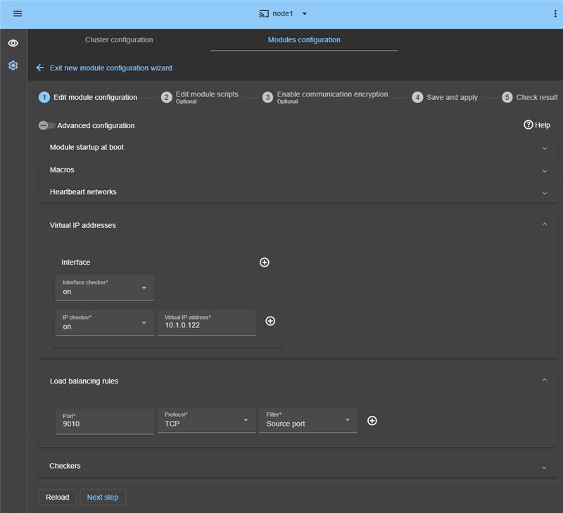 , you will be able to configure checkers if needed, such as process monitoring, custom checkers, TCP, ping, or split-brain checkers.